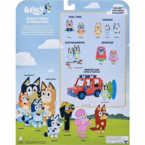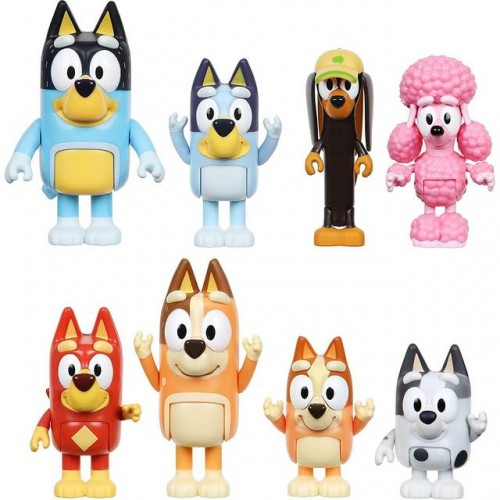 Koe Blueyn, hänen perheensä ja heidän ihastuttavien ystäviensä ilo! Nyt voit tuoda kotiin koko Blueyn perheen – Blueyn, Bingon, Isä Banditin ja Mother Chilin – sekä Blueyn rakkaiden ystävien Rustyn, Cocon, Snickersin ja Muffinin. Vietä tunteja luoden omia hauskoja tarinoitasi ja pelejäsi tai elä suosikki-TV-jaksojasi uudelleen! Bluey, rakastettava kuusivuotias Blue Heeler, muuttaa arjen perhe-elämän loputtomiksi, leikkisiksi seikkailuiksi. Näissä hahmoissa on liikkuvat kädet ja vartalot, joiden avulla voit luoda Bluey-shown ikimuistoisimmat hetket. Sisältää 8 hahmoa Bluey-TV-sarjasta: Bluey, Bingo, Father Bandit, Mother Chili, Rusty, Coco, Snickers ja Muffin.